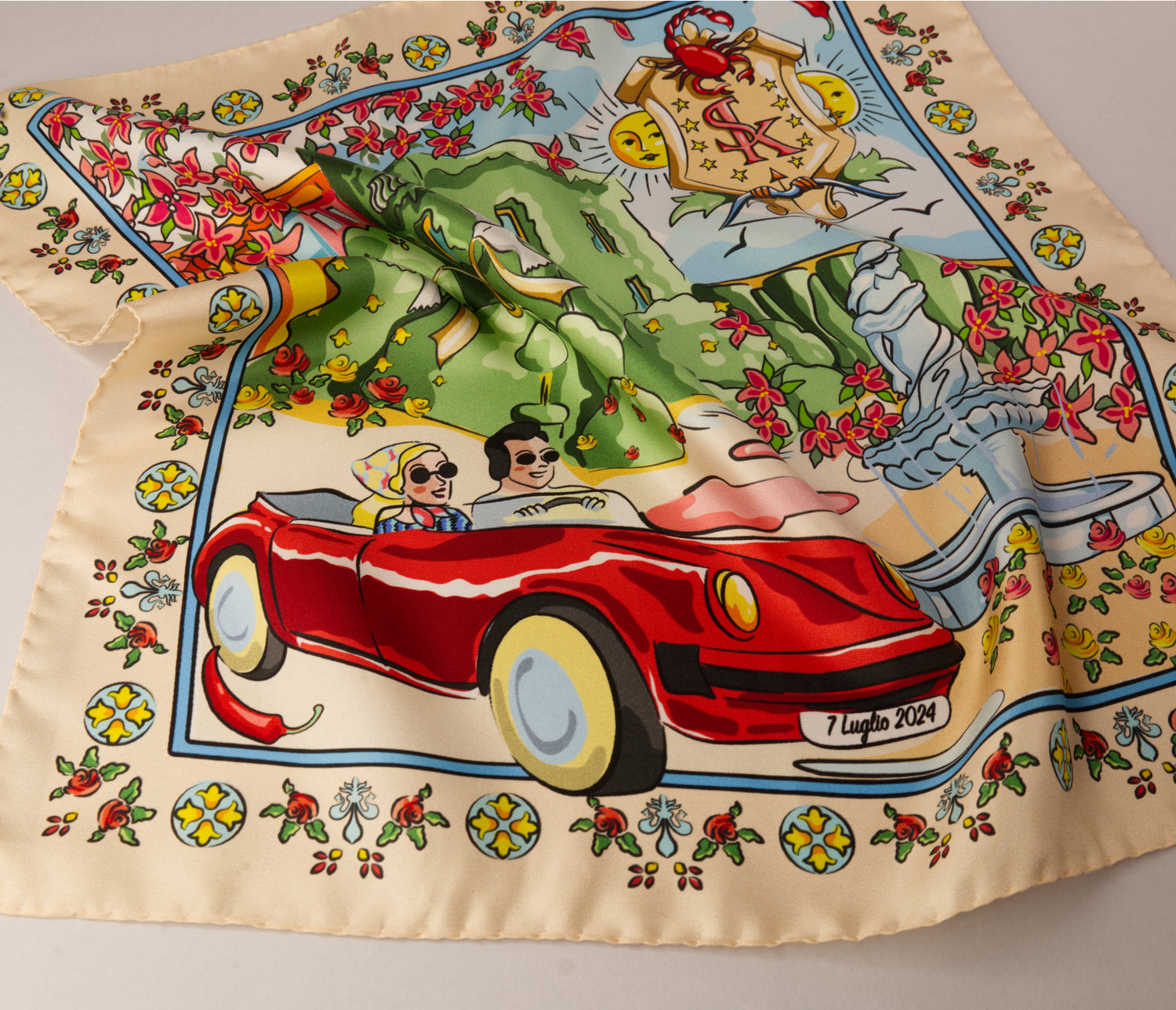Un foulard in seta 45x45 cm creato su misura per raccontare, attraverso il disegno, la storia unica di una coppia. Ogni elemento illustrato è un simbolo che appartiene al loro mondo: niente è decorativo per caso.